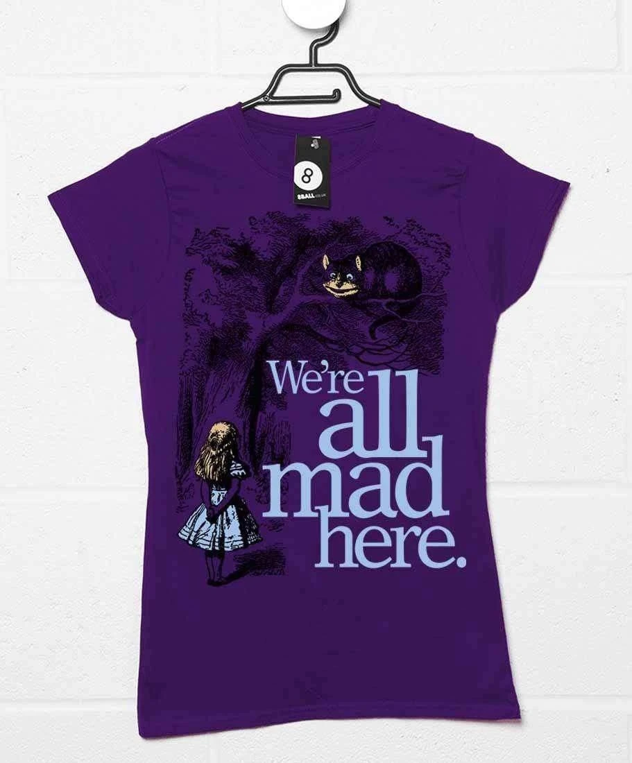 This ladies Alice in Wonderland t-shirt has original artwork from Lewis Carroll’s novel ‘Alice In Wonderland’, as illustrated by John Tenniel for the classic book first published in 1865. Shows the legendary Cheshire Cat up a tree with Alice looking up at him, along with the text “We’re all mad here”. Forget Tim Burton’s movie, this was the original and best!