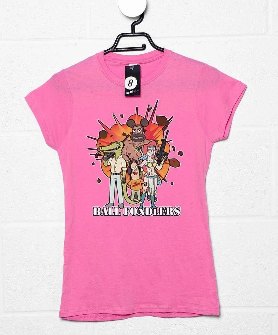 Thisladies fitted-style t shirtis based on the greatest TV show in the multiverse.The tee showsAttila Starwar, Benjamin, Fulgora and Loggins, with a Ball Fondlers logounderneath andan explosion behind. If only we had interdimensional televison so we couldsee it…