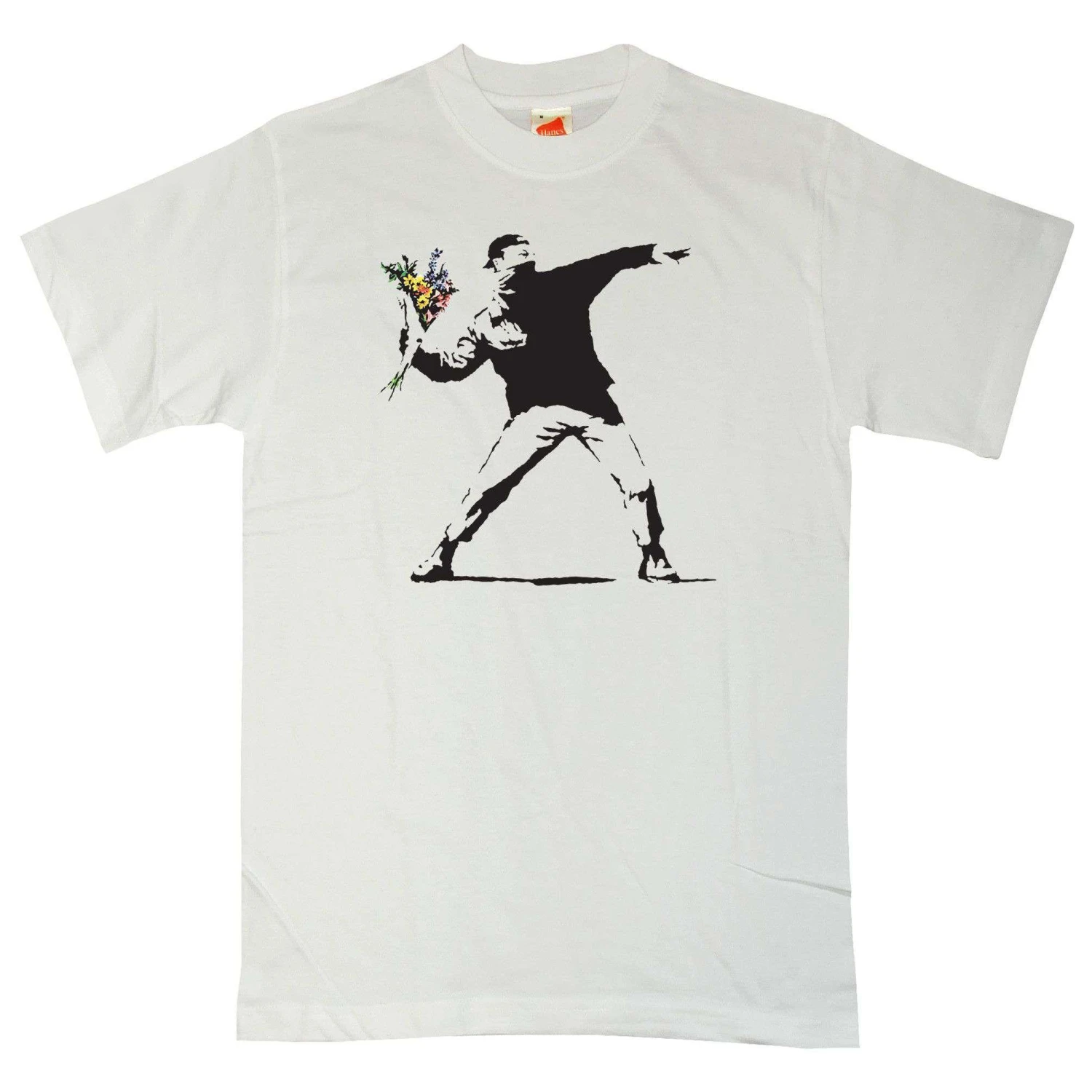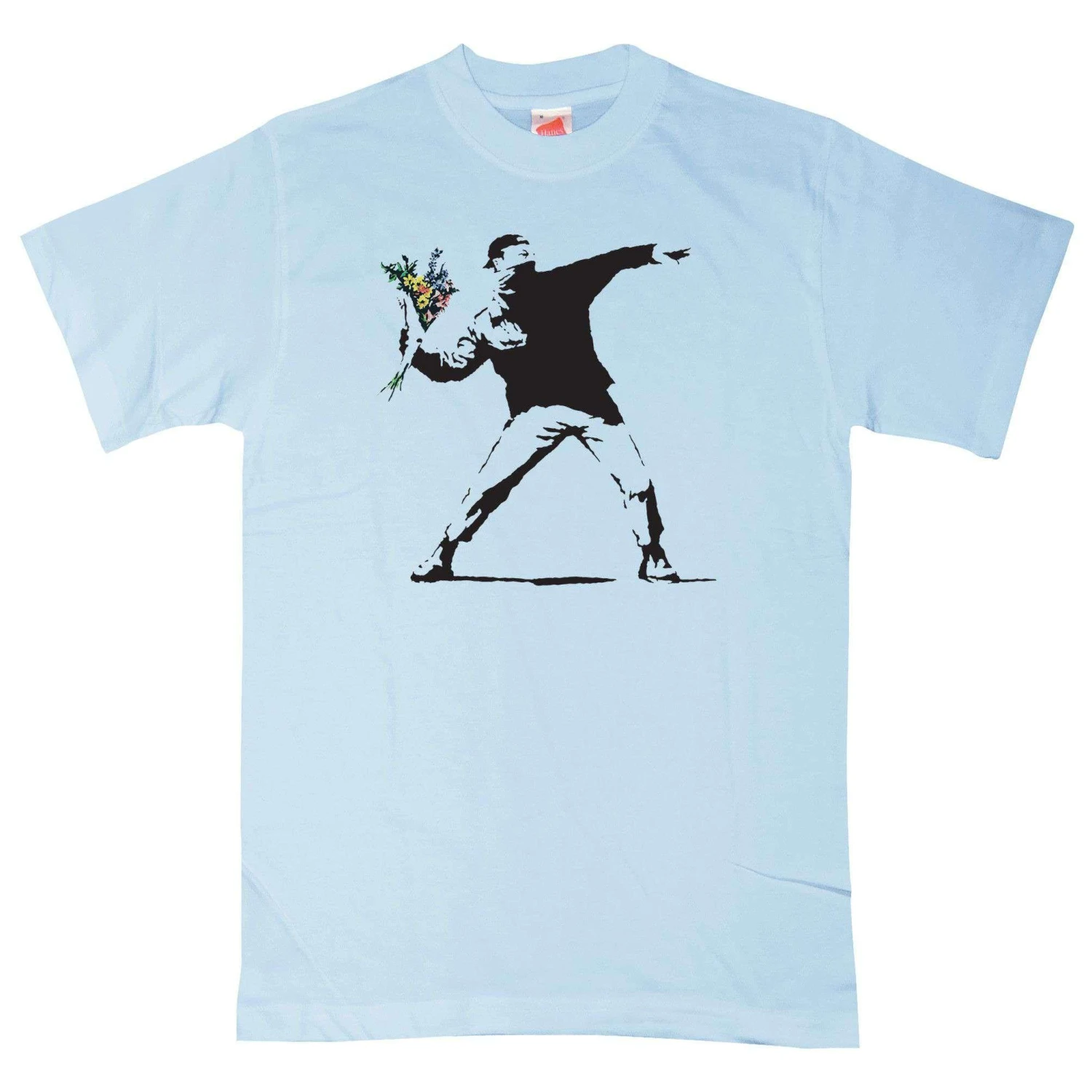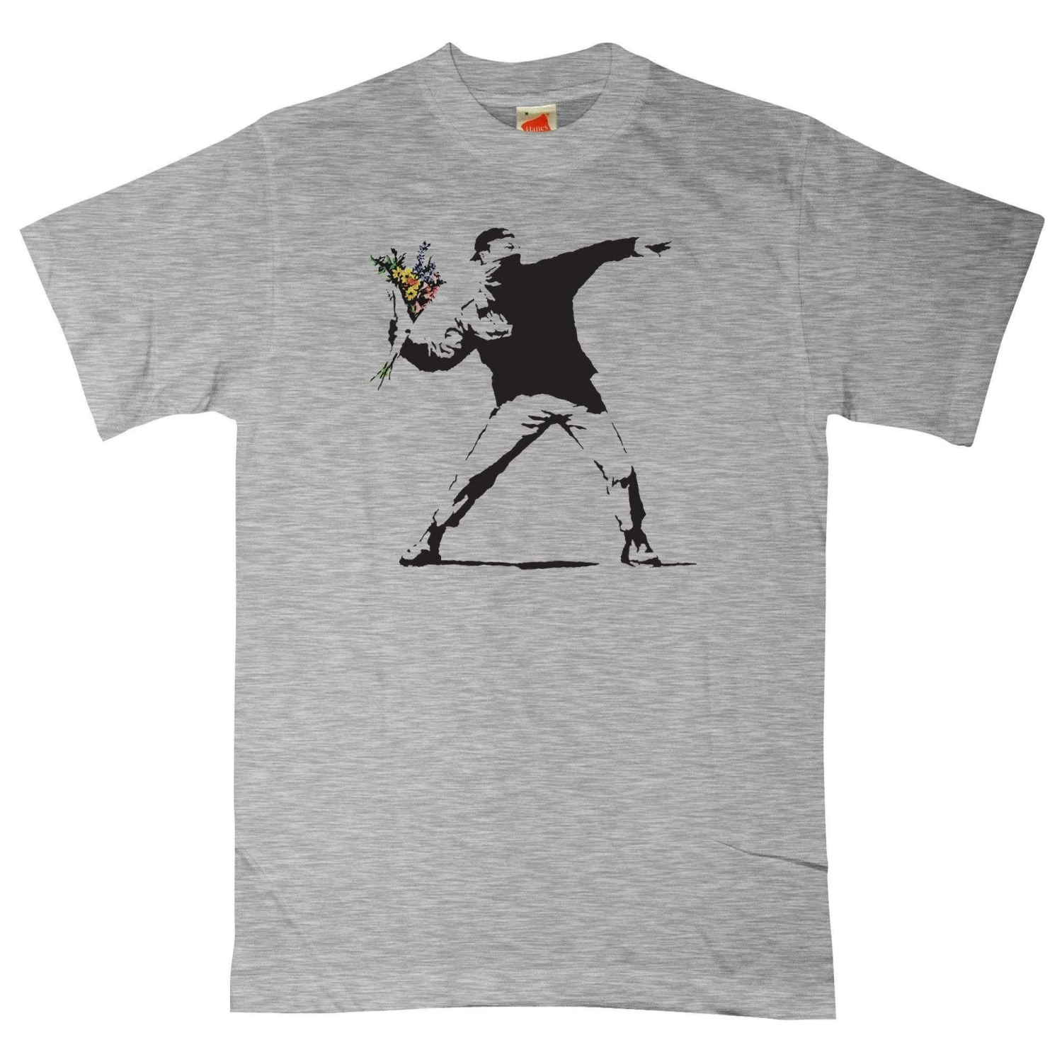 This Banksy tshirt features an image of a rioter wearing a mask and baseball cap backwards, who instead of hurling a brick or petrol bomb is preparing to throw a bunch of flowers instead. This is a 100% cotton Banksy t shirt. 10% of all royalties from our Banksy t-shirt range are donated to charity. You can find out more about the charities which 8Ball supports in the help section of our website. Thanks for your support.