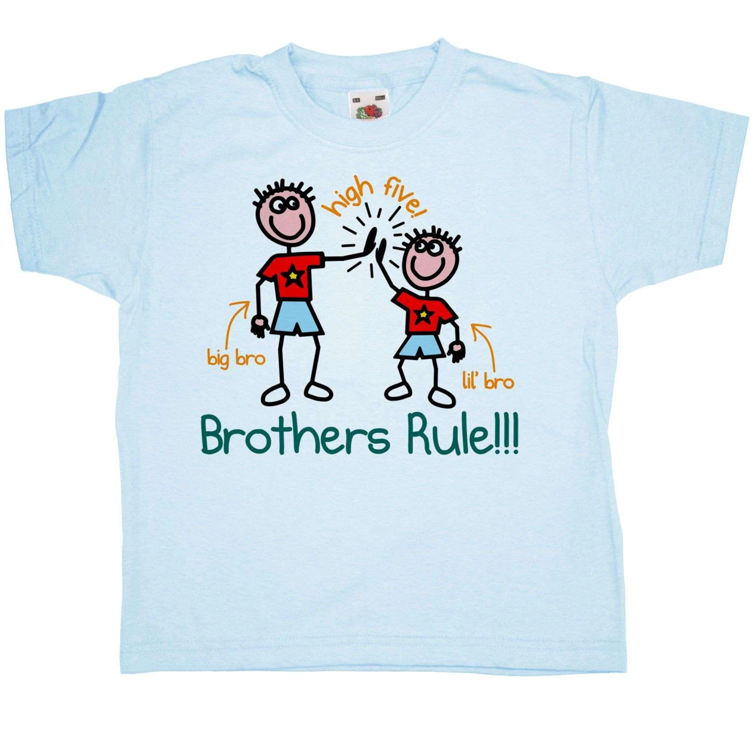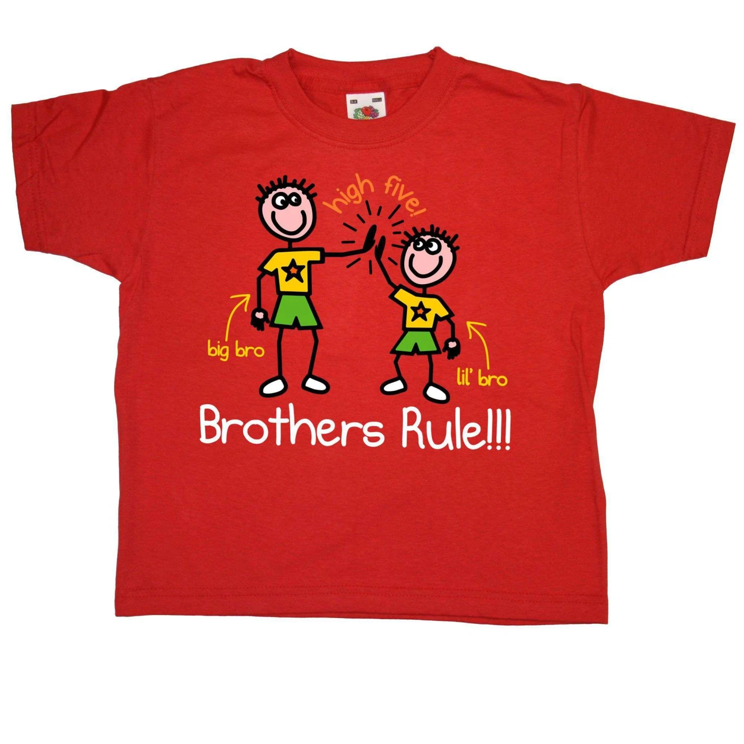 This kids t-shirt is perfect for all those kids out there whose best friend is their brother! Has an image of a big brother and a little brother giving each other a high five, drawn in a childlike style. Also has the slogan “Brothers Rule” underneath and small text saying “Big Bro” and “Lil’ Bro”, with arrows pointing to the figures. This is a 100% cotton brothers rule t-shirt.