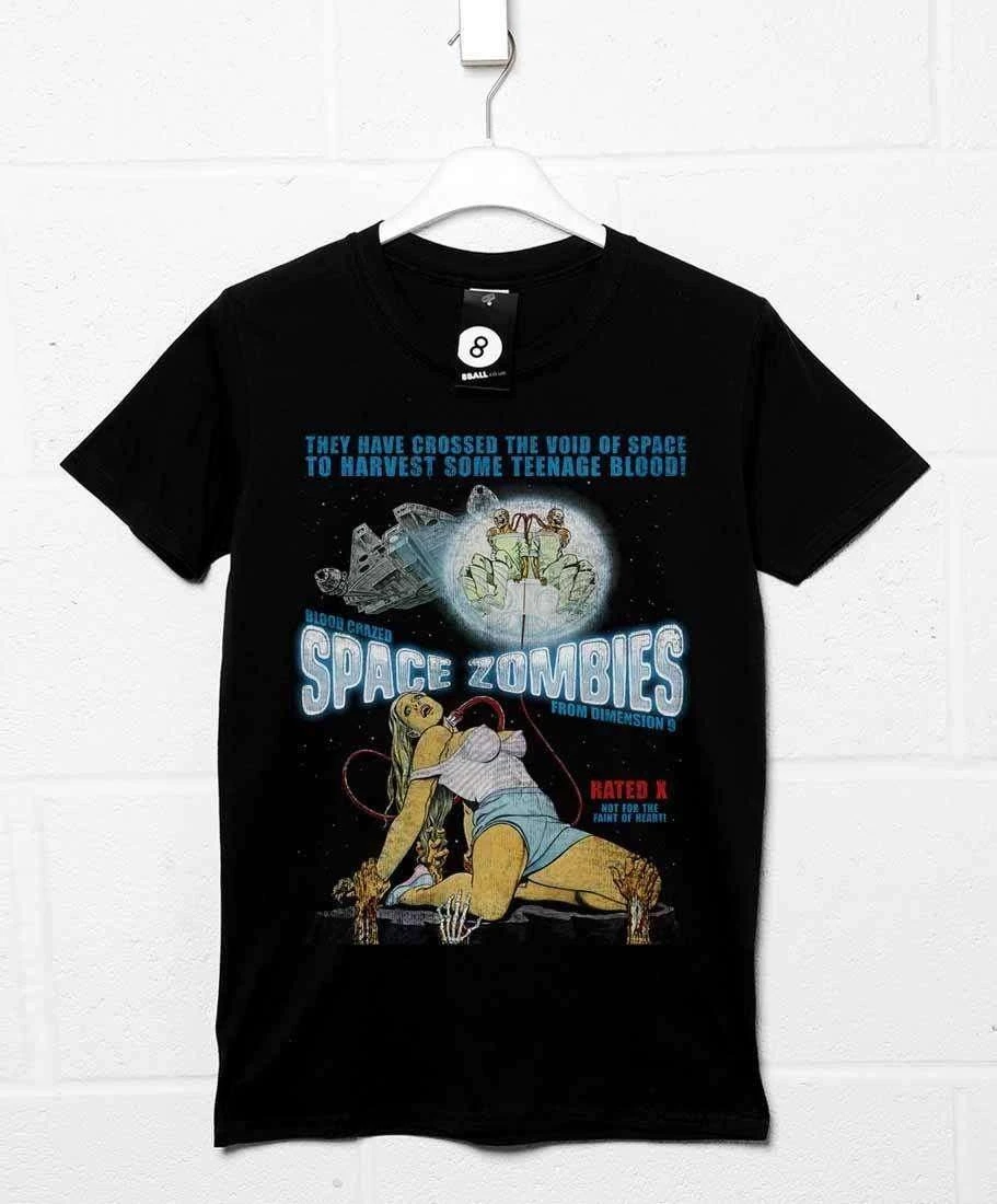 This Deathray B Movie tee features an image of a scantily-clad young girl having her blood sucked out by weird floating skull-faced aliens while being clawed at by zombies hands from below. Also has an image of a rather familiar looking spacecraft in the background although we’re sure thats just a coincidence – right? This is a heavy cotton tee with a distressed print for a retro look.