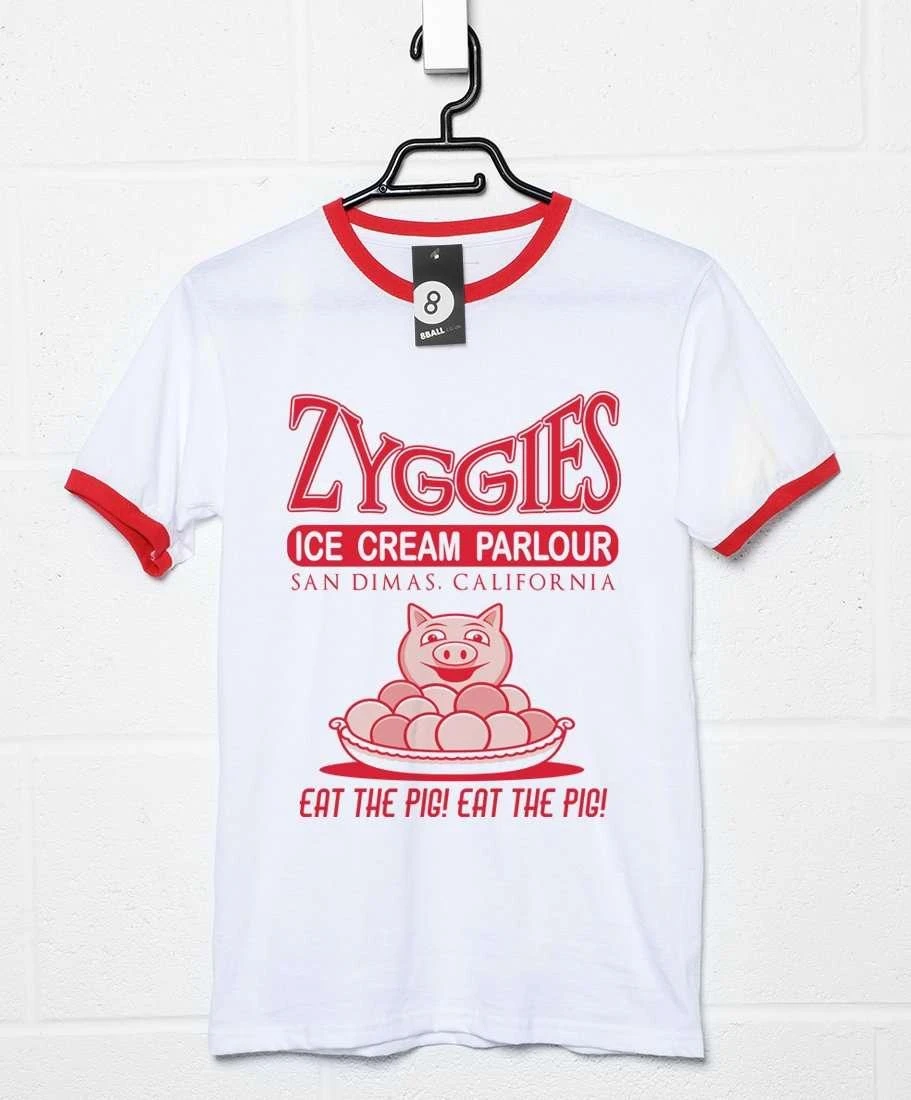 This Fahrenheit 451 design pays homage to Zyggies – the ice cream parlour visited by Napoleon Bonaparte in Bill and Ted. The design is based on the bib which Napoleon wears while devouring the Zyggie Pig, proving that he is a “Zyggie Piggy! Zyggie Piggy!” The design reads “Zyggies Ice Cream Parlour – San Dimas, California – Eat the Pig! Eat the Pig”. This is an original Fahrenheit 451 t-shirt and not officially licensed Bill and Ted merchandise.