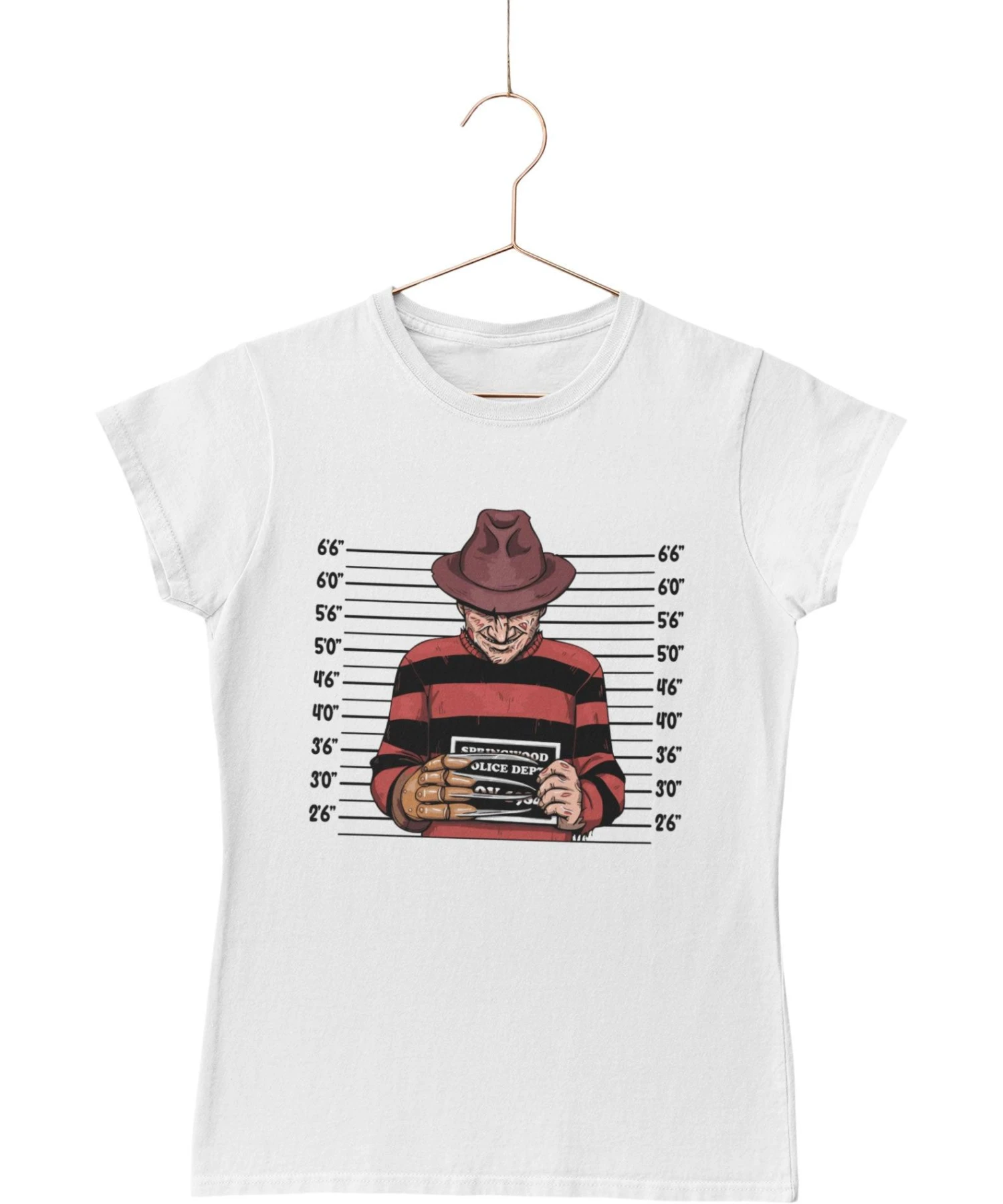 This women’s fitted t-shirt Freddy Krueger design, inspired by the Nightmare on Elm Steet franchise, features the murderous knife-fingered dream villain in what we think would be his eventual mugshot (not that that will ever happen). Please note this is a fan tribute item and is not official merchandise.