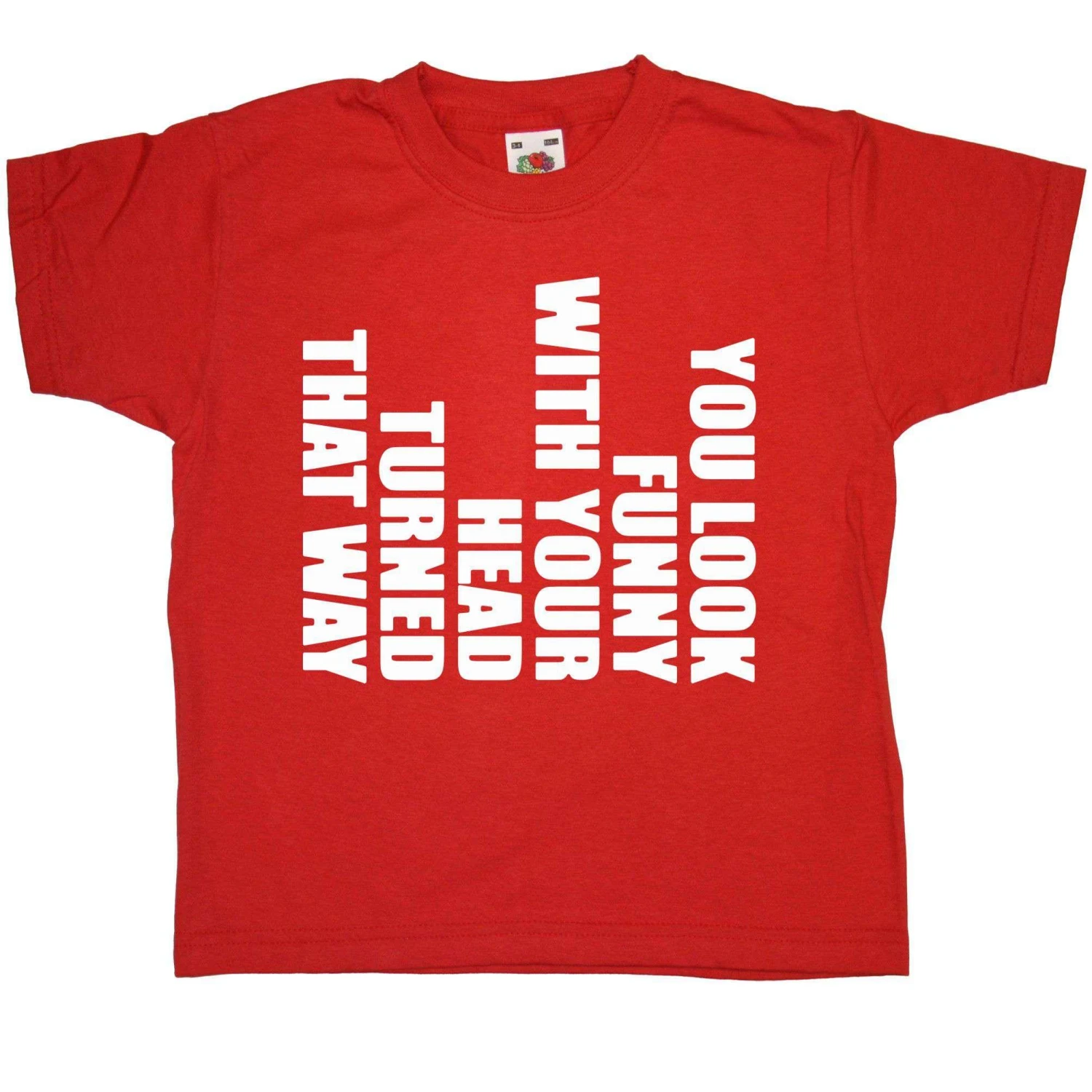 This Kids slogan t-shirt has a sideways printed slogan that says “You look funny with your head turned that way”. Now you can have a laugh at anybody who turns their head sideways to try and read your kids tee! This is a kids 100% cotton funny t-shirt.