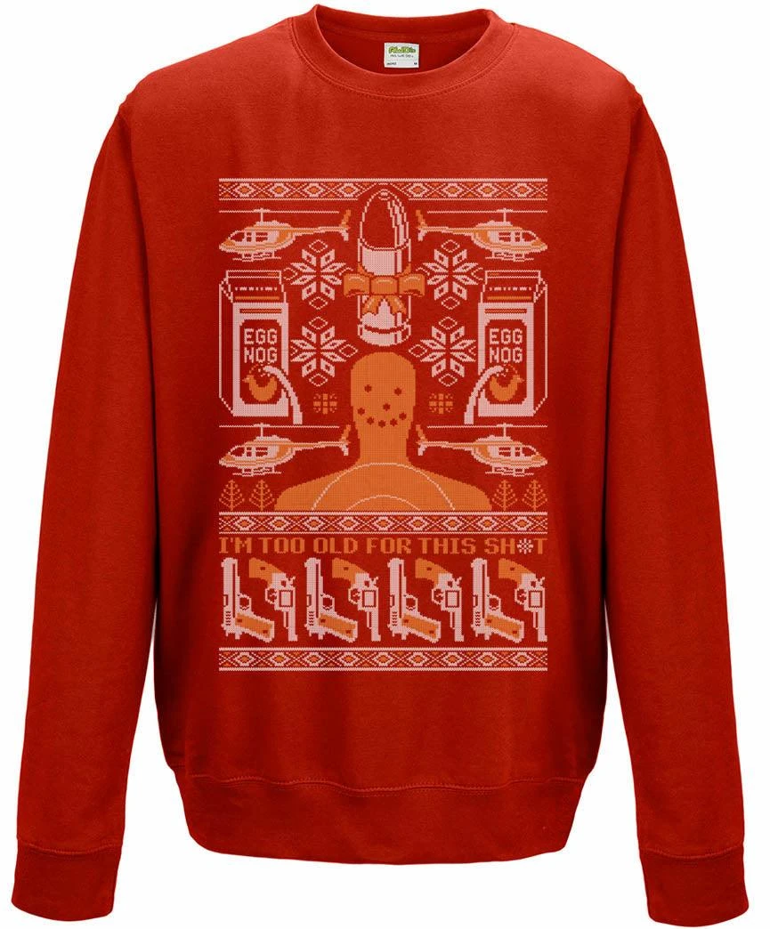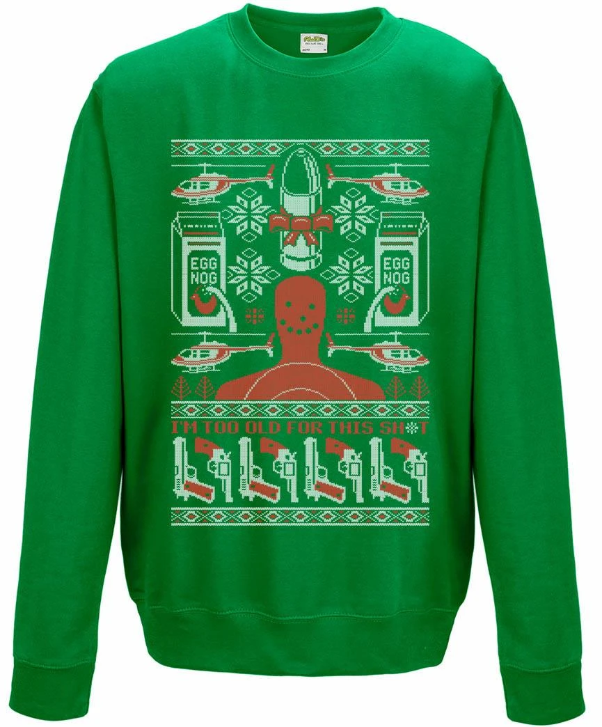 Capturing the greatest Christmas movie of all time (take THAT Die Hard!), this knitted-look design features the bullet-through-the-eggnog moment, Riggs’ suicide bullet wrapped in a bow, the smiley-face-target-man and other great moments from the movie.