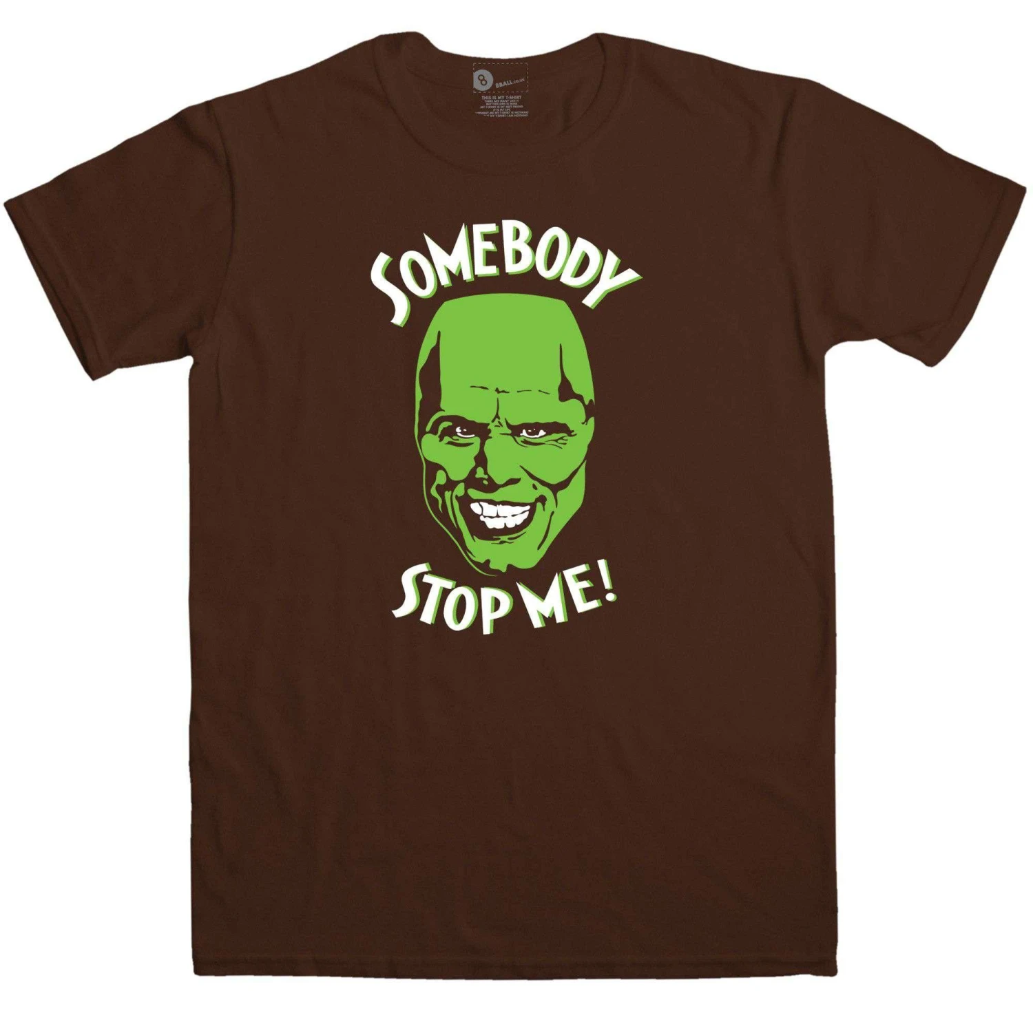 This inspired by t-shirt features a cracking graphic of The mask played by Jim Carrey in 1994, the Mask was a superhero fantasy film based on the original comic series by Dark Horse Comics. The slogan for this tee is ‘Somebody stop me!’ which was a memorable catchphrase used by Jim Carrey in the movie. This is an inspired by t-shirt.