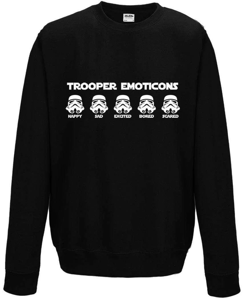 People tend to forget that Stormtroopers have feelings too. This Hoodie/Sweatshirt displays the range of Stormtrooper emotion, from the boredom of guard duty through to the terror of finding out the death star you’re standing in is about to blow up. In fact the only emotion missing is embarrassment which was seen in a New Hope when that poor Stormtrooper banged his head on the door. Please note this is not an officially licensed product.